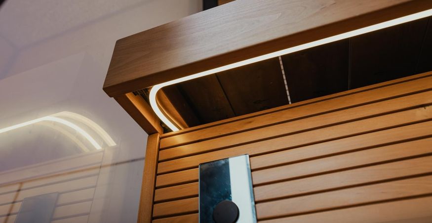 For wood-fired sauna versions, there is a switch inside the sauna. In the case of electrically heated versions, the lighting can be managed either via the local controller or through the mobile application.