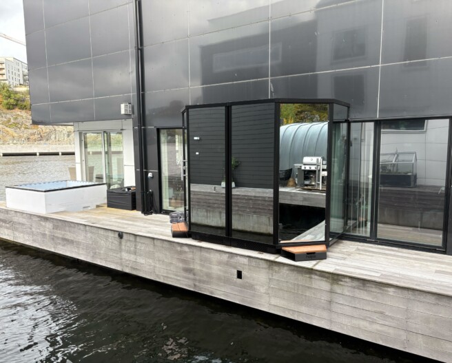 In Hele Single, our design incorporates LED lights positioned beneath the benches, intentionally obscuring the direct visibility of the light source. This deliberate arrangement contributes to diminished transparency through the glass panel. To further enhance the level of privacy, LED lights have been placed beneath the eaves around the sauna. The light from these LEDs is cast onto the glass surface, inducing a heightened degree of reflectivity.