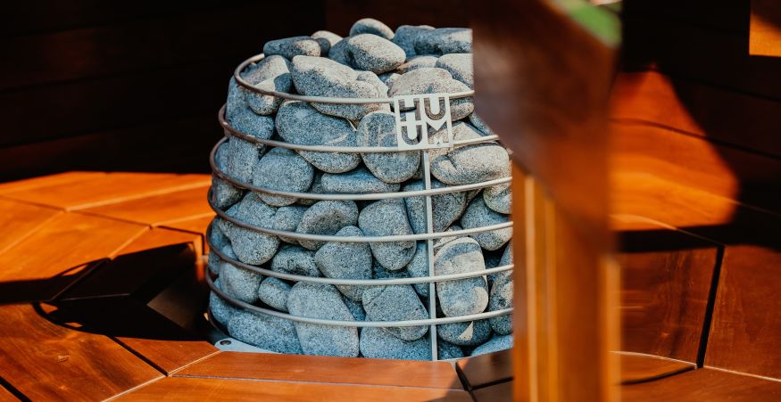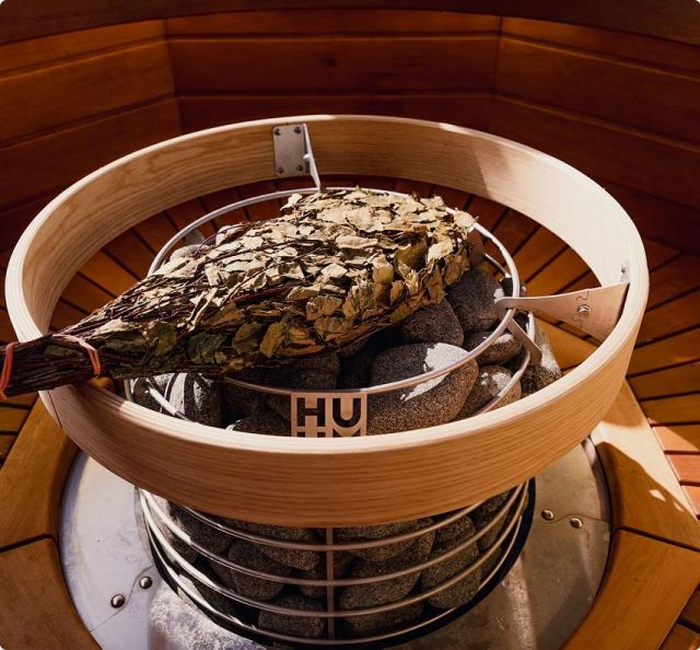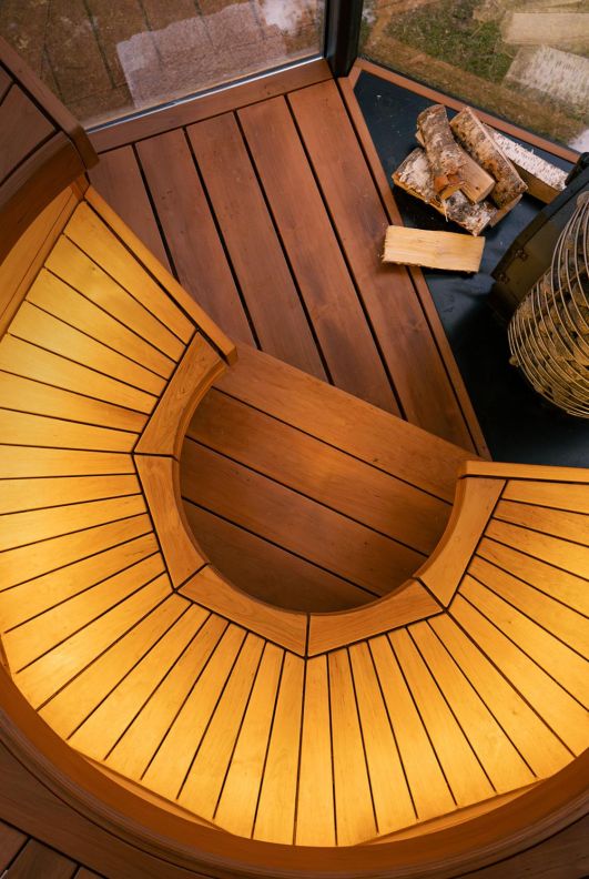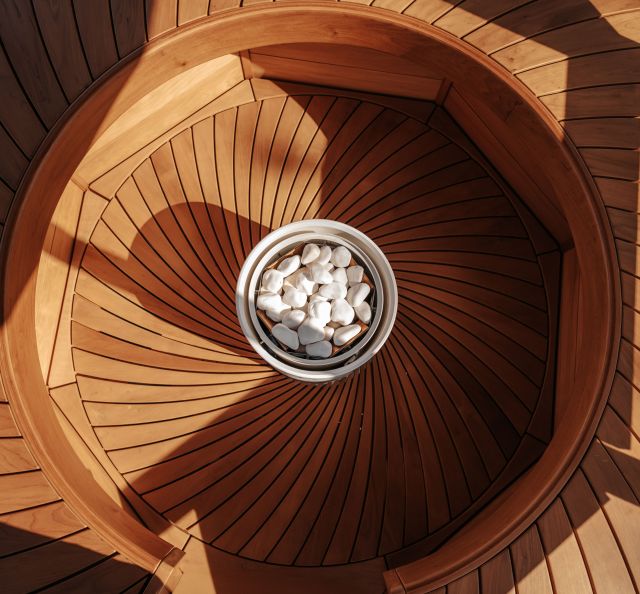 Each of the seven seats are formed by converging rays which all point to a centrally placed large stone basket heater. This amount of thermal mass takes longer to heat up, but also provides a subtle and long-lasting steam. The luxury interior in Hele Single is only available with an electric heater.