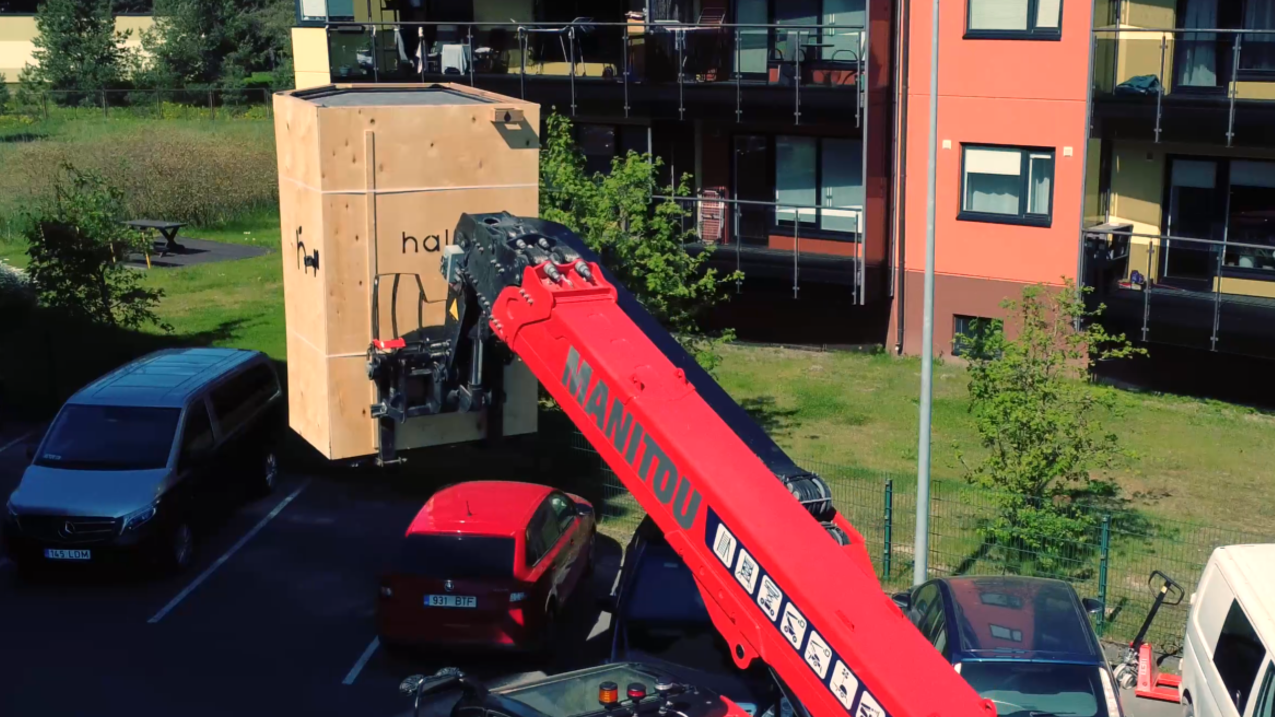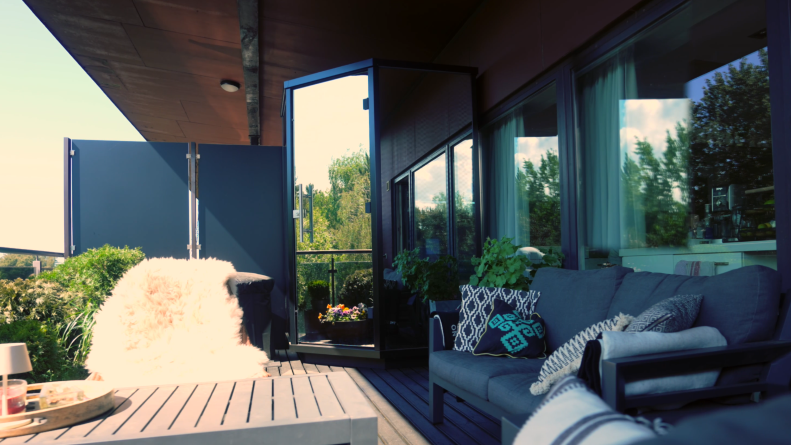 This Hele Mini sauna was installed on a rooftop terrace beneath an overhang, lifted carefully into position using a telehandler. To allow access, the safety railing was temporarily removed and later professionally welded back into place. In addition, a custom access panel was incorporated into the back wall of the sauna to maintain access to a water outlet located in the corner of the installation site.