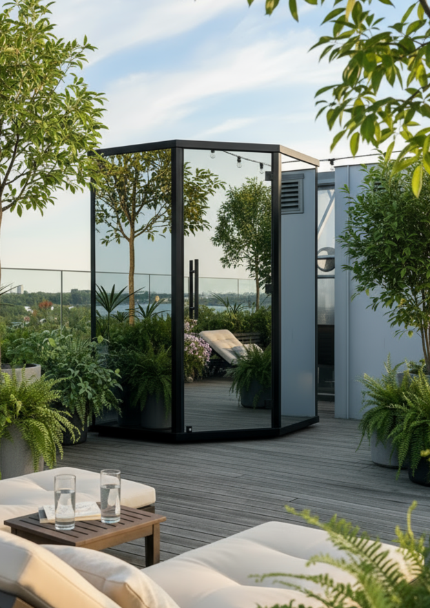 Sauna with a changing room. For up to 7, doubling space and enhancing shared experiences.