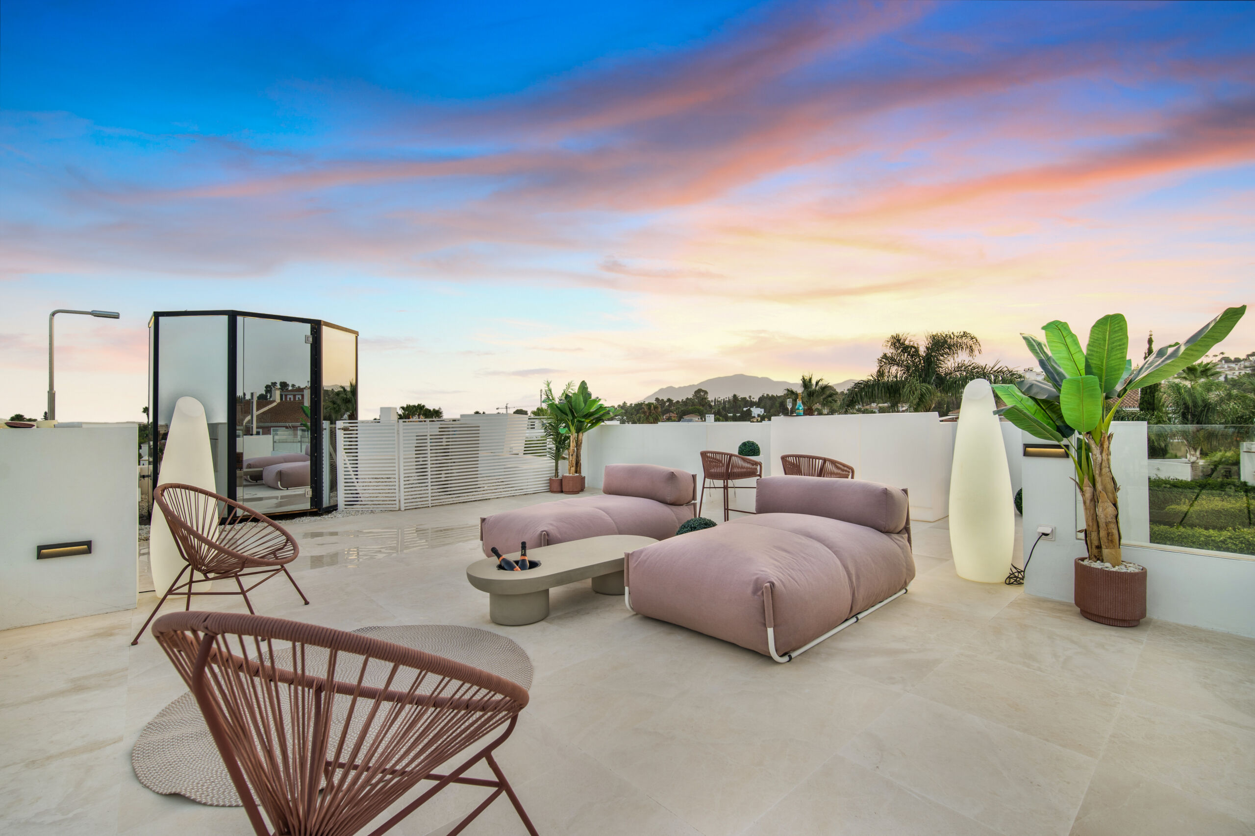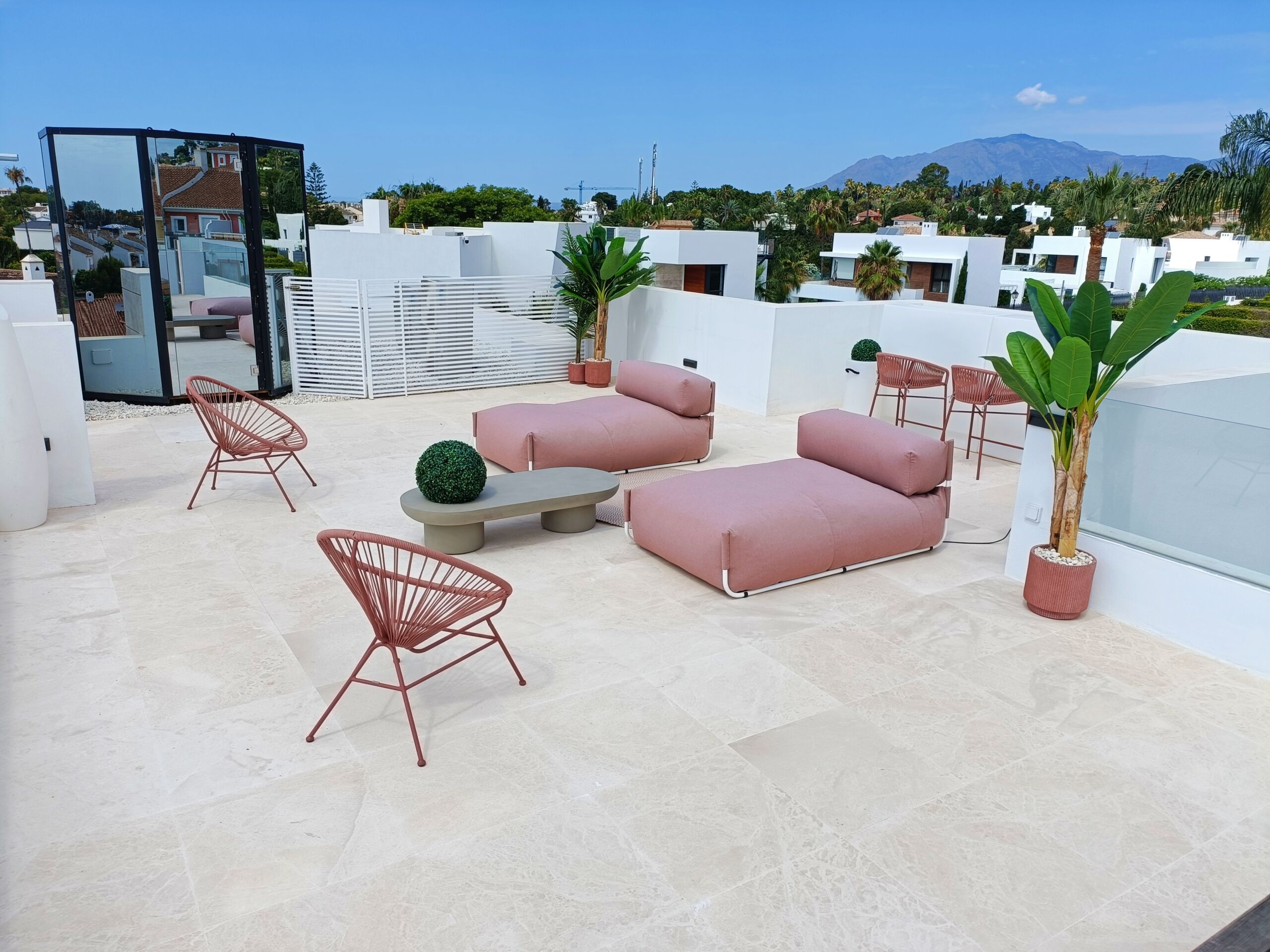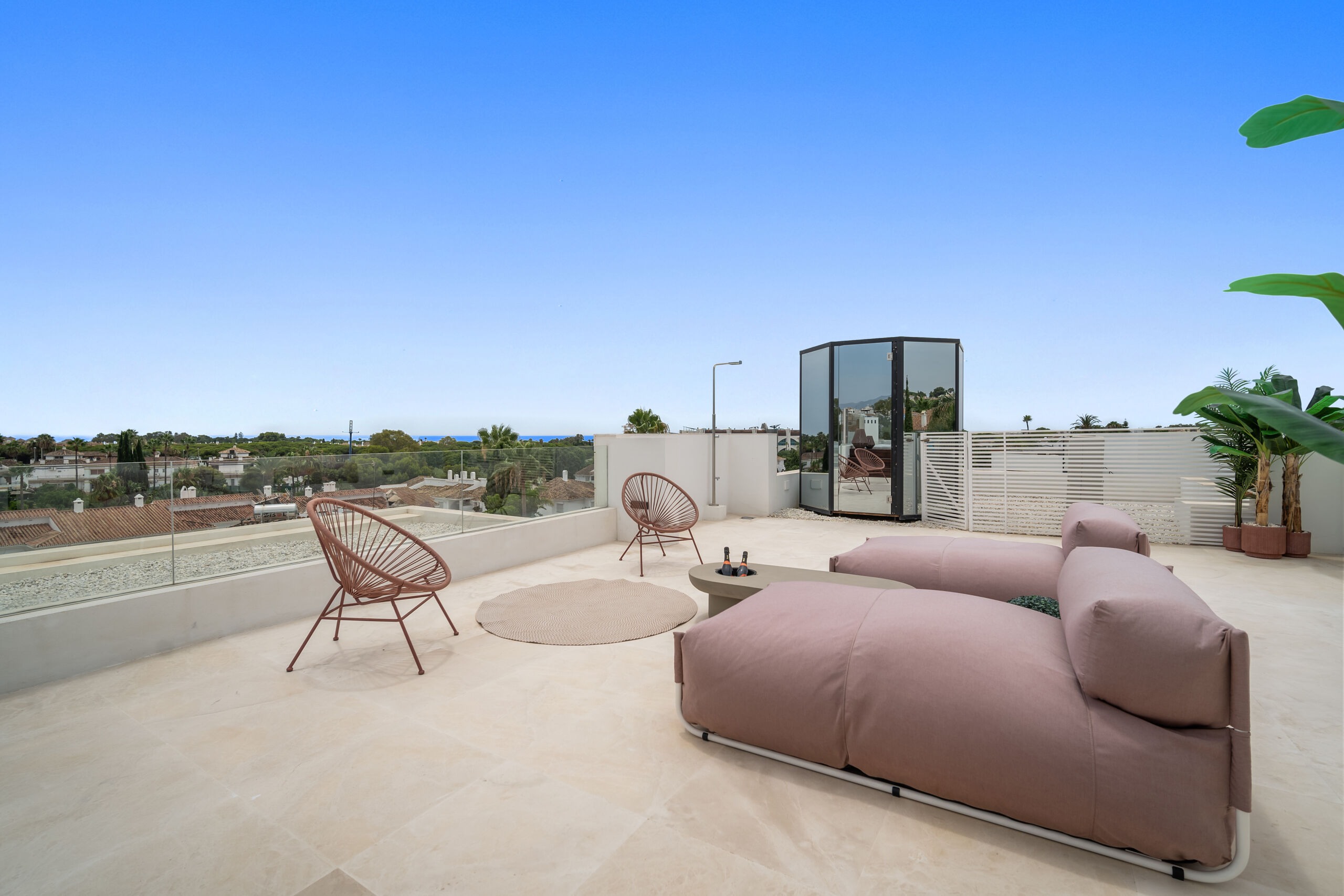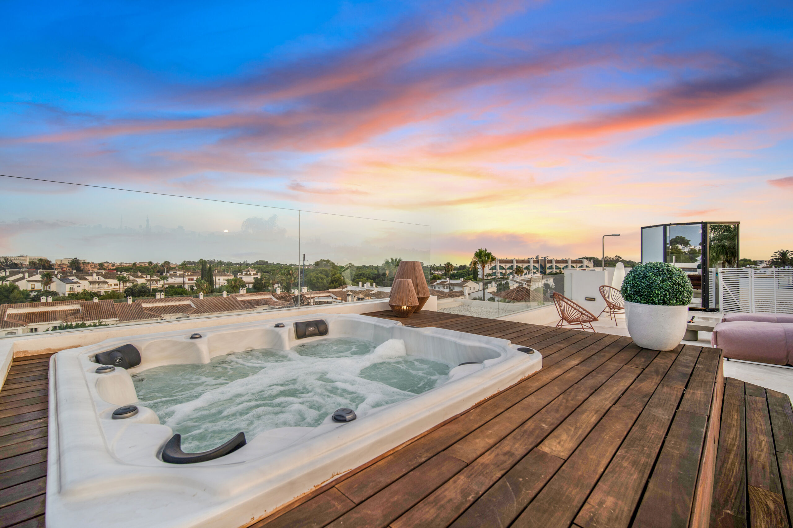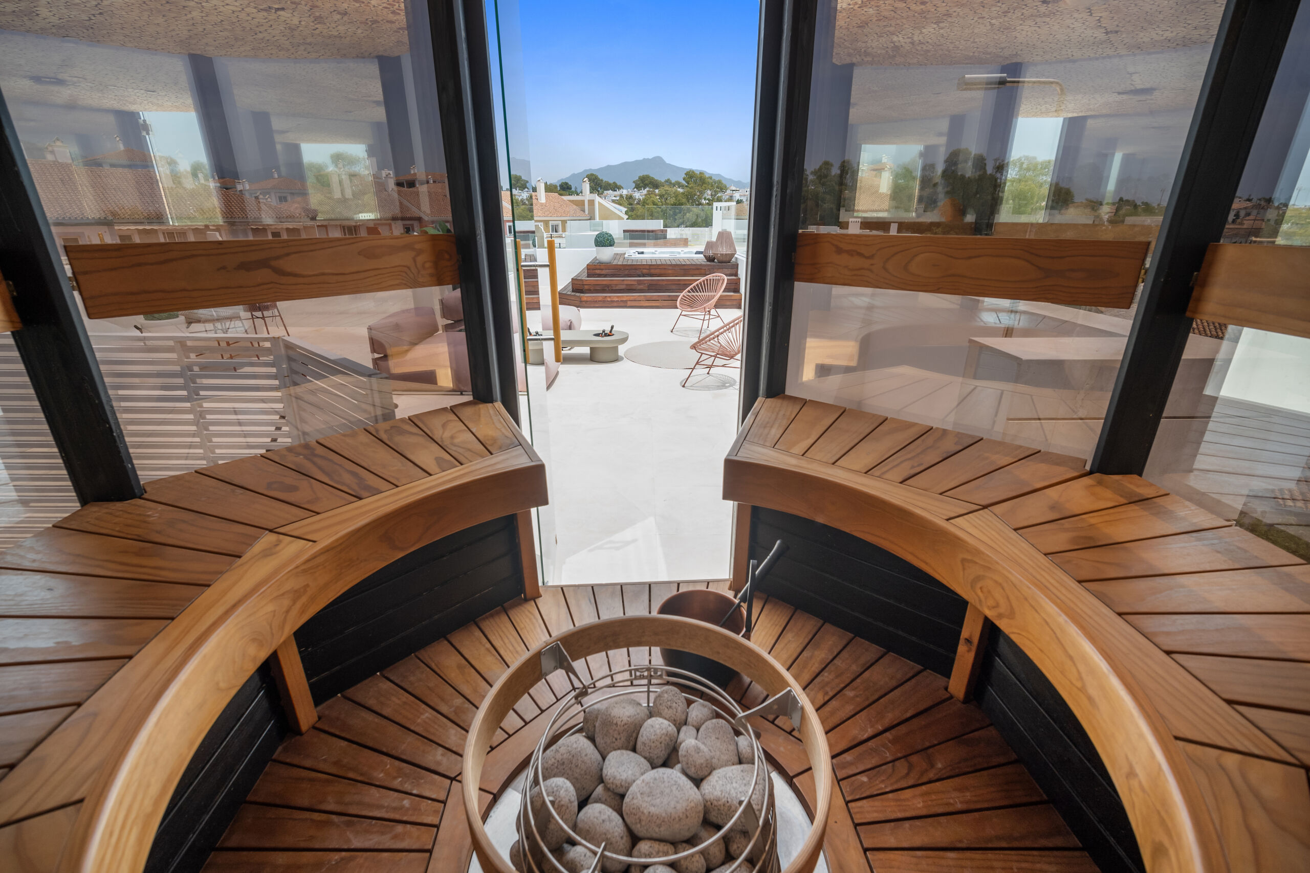 The roof of the villa has a full relaxation zone with a large Jacuzzi, a bar, luxurious lounge beds and our very own Hele Single sauna.